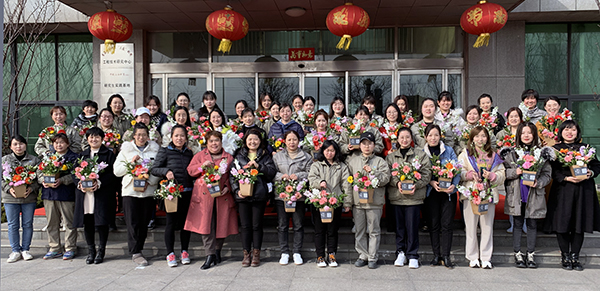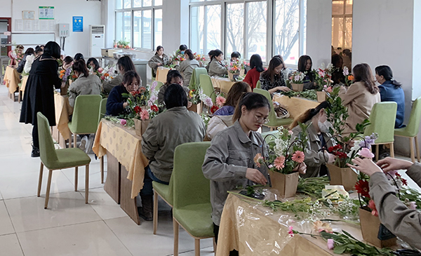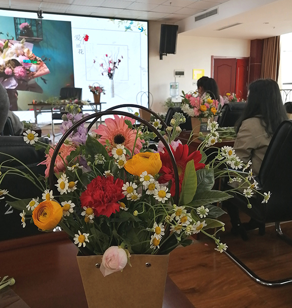 動特邀花藝講師進行講解示范,在介紹了插花的造型要素和技巧手法后,講師通過現場演示,指導大家制作出一簇簇精美的花藝作品。一支支黃玫瑰、紫羅蘭、洋甘菊......經過女同胞們的巧手修剪、色彩搭配,構思細致地置入花籃,變的錯落有致、賞心悅目,也寄托了大家對美的理解和對幸福的感悟。